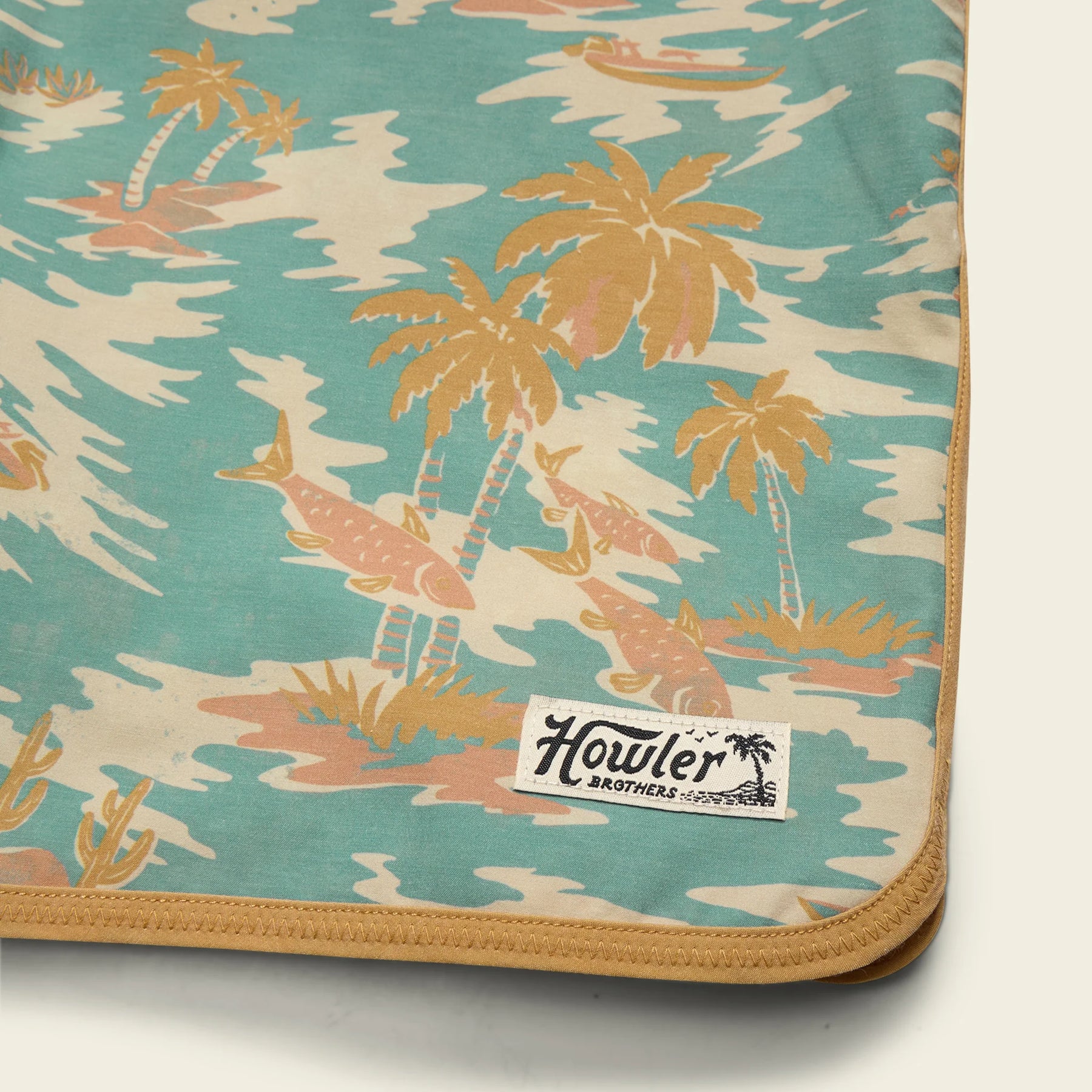 Palm tree patterned fabric with Howler Brothers label on a white background